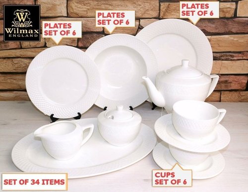 6 Dessert plates 8″ – (WL-880100/A)6 Deep plates 9″ – (WL-880102/A)6 Dinner plates 10″ – (WL-880101/A)1 Oval Platters 14″ X 10″ – (WL-880103/A)6 teacups 8 OZ – (WL-880105/6C)6 Saucers – (WL-880105/6C)1 Sugar bowl & creamer 11 OZ – (WL-880112/2C)1 Teapot 30 OZ – (WL-880110/1C)Snow-white plates by WILMAX turn an everyday lunch or dinner into a festive one. Dazzling porcelain tableware looks very elegant on any table. It is durable and heat-resistant, microwave and dishwasher safe, and is easy to clean. All WILMAX tableware is produced using only eco-friendly materials and following all the sanitary and epidemiological requirements. It is absolutely safe even for the youngest members of your family. Wilmax porcelain is always the perfect choice for a modern kitchen.