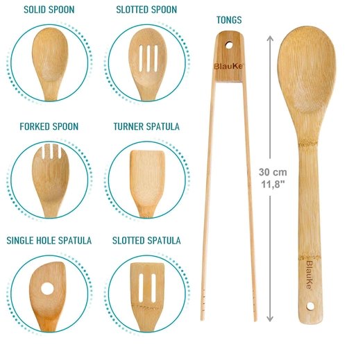 • Bamboo kitchen utensils set includes: wooden spatula for cooking, single hole mixing spoon (spaghetti spoon), slotted spoon, slotted spatula, wooden cooking spoon, forked spoon, and kitchen tongs.